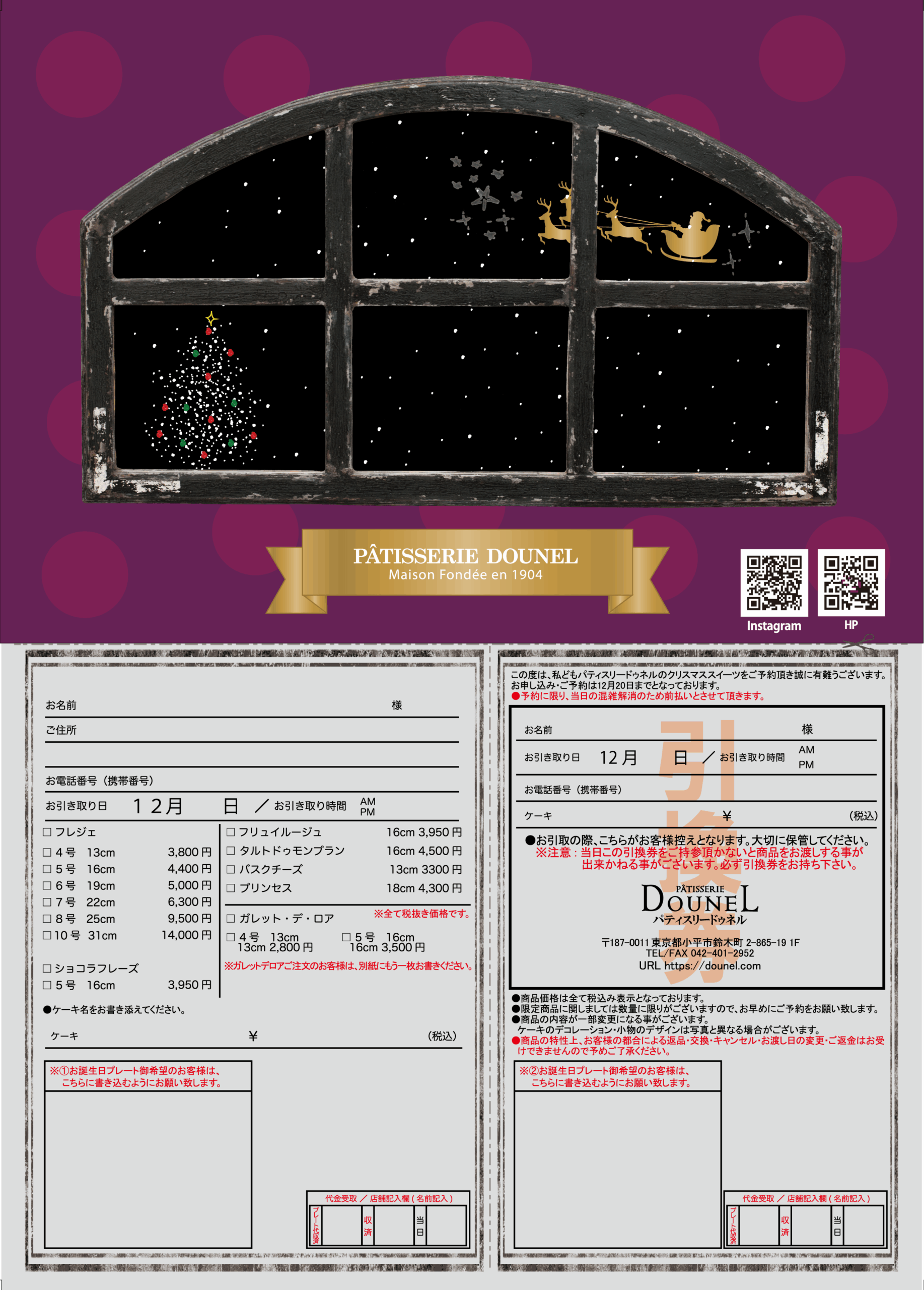 Christmas Cake 2025 ご予約承っております。 クリスマスケーキご予約の申し込み期限は、12月20日(土)になります。ご予約は店舗にてご注文承ります。 ●予約に限り、当日の混雑解消のため前払いとさせていただきます。●商品価格は全て税抜き表示となっております。●限定商品に関しましては数量に限りがございますので、お早めにご予約をお願いいたします。●商品の内容が一部変更になる事がございます。ケーキのデコレーション・小物のデザインは写真と異なる場合がございます。●商品の特性上、お客様の都合による返品・交換・キャンセル・お渡し日の変更・ご返金はお受けできませんので予めご了承ください。